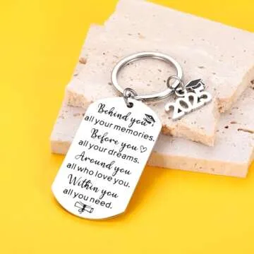 Show more Celebrate a momentous milestone with the TI-EDC Graduation Gifts for Her Him Class Of 2025 Graduation Keychain. This elegant and meaningful keepsake is designed to embody the journey of graduates, engraved with the heartfelt message: "Behind you all your memories. Before you all your dreams. Around you all who love you. Within you all you need." Crafted from high-quality stainless steel, this keychain serves as a perfect graduation gift that not only commemorates their achievements but also inspires them as they step into a new chapter of life.