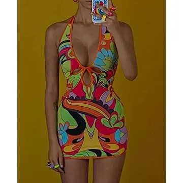 Tie-Dyed Straps Halter Dresses for Women Backless Bodycon Mini Skirts Vintage Y2K Fashion Clubwear Streetwear (Abstract Pattern Multicolor, Small)