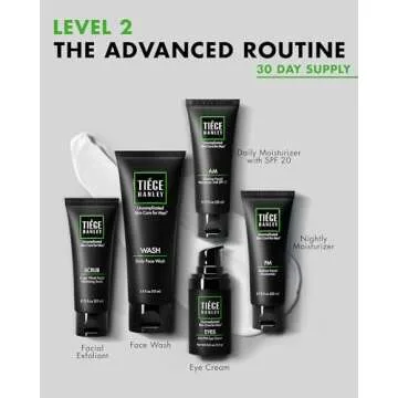 Show more Elevate your skincare routine with the Tiege Hanley Men's Skin Care Set, Advanced Skin Care Routine for Men (System Level 2), where innovation meets simplicity. This expertly curated skincare kit is crafted to address all your grooming concerns—from fine lines to dry skin—ensuring that you look your best every day. The thoughtfully selected products include a revitalizing face wash (2.5oz) and a gentle exfoliating scrub (0.75oz) that work together to cleanse and rejuvenate your skin. Protect your complexion with the AM moisturizer that features SPF 20 (0.75oz), perfect for daytime hydration and sun protection. As you unwind each evening, the PM moisturizer (0.75oz) will nourish your skin while you sleep, promoting a youthful appearance and restoring elasticity. Don't forget the eye serum (0.5oz), meticulously formulated for the delicate eye area, which helps reduce dark circles and crow’s feet.