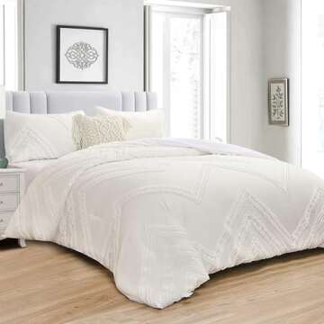 Show more Introducing the TIFFICO White Queen Size Comforter Set—a luxurious fusion of style and comfort designed for modern living. This exquisite boho tufted jacquard textured striped comforter set, measuring 90 x 90 inches, is crafted from premium microfiber, ensuring an incredibly soft and cozy feel. The lightness of the fabric allows it to envelop you gently like a cloud, perfect for achieving a restful night's sleep. Alongside the stunning comforter, you also receive two matching pillowcases (20 x 26 inches) to enhance your bedding ensemble. Transform your bedroom into a tranquil retreat with this elegant and versatile set, where comfort meets aesthetic charm.