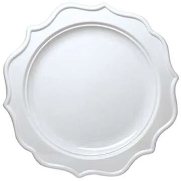 Show more Introducing the Tiger Chef 96-Pack White Color Round Scalloped Rim Disposable Plastic Plate Set, specifically crafted for those who wish to add a touch of elegance to their events without compromising on convenience. With a stylish scalloped rim design, these plates are perfect for birthday parties, elegant banquets, and casual gatherings alike. Each set includes 48 durable 10-inch dinner plates and 48 8-inch salad plates, making them ideal for serving both main courses and appetizers. Made from BPA-free plastic, this set combines safety and style, ensuring your dining experience is both upscale and worry-free.