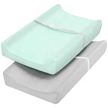 Show moreThe TILLYOU Changing Pad Cover Set is designed with both functionality and style in mind. Made from ultra-soft jersey material, these covers fit perfectly on standard 32"/34" x 16" contoured changing pads. The set includes two beautiful colors: a calming light green and a soothing light gray, ensuring that your nursery not only stays clean but looks great too. The smooth, wrinkle-free fabric is ideal for keeping your little one comfortable, and the covers feature carefully designed holes that align seamlessly with the straps on your changing pad, ensuring maximum security.