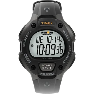 Show moreDiscover the Timex Men's Ironman Triathlon Classic 30 38mm Watch, a perfect companion for both everyday wear and high-intensity workouts. Featuring a sleek gray and black 38mm resin case with a durable black adjustable resin strap, this watch combines style and functionality for anyone who wants to keep time without sacrificing versatility. Designed to fit wrists up to 8 inches in circumference, it offers comfortable wear throughout the day. The vibrant gray digital display is not just visually appealing; it also features an Indiglo light-up watch dial for easy reading in any lighting conditions.