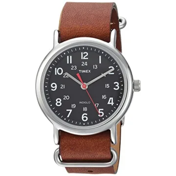 Show moreIntroducing the Timex Unisex Weekender 38mm Watch, your perfect companion that masterfully combines elegance and functionality. This impeccable wristwatch is crafted specifically for the discerning individual who appreciates style and precision. Its classic silver-tone brass case paired with a striking black dial showcases full Arabic numerals alongside a convenient 24-hour military time display. The adjustable brown genuine leather slip-thru strap ensures a comfortable fit for all wrist sizes up to 8 inches. Notably, this watch is equipped with the innovative Indiglo light-up dial, which offers exceptional visibility in low-light situations. Thanks to the robust mineral glass crystal, the watch is designed to resist scratches, maintaining its aesthetic appeal even with daily wear.