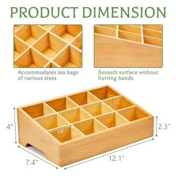 Show moreIntroducing the TIMIEEYA Tea Bag Organizer, a beautiful and functional addition to any tea lover’s collection! Crafted from 100% premium bamboo, this elegant and sturdy tea storage solution features 12 spacious compartments that allow you to neatly organize your favorite tea bags and coffee packets. Its single-layer trapezoidal design not only maximizes space but also makes it incredibly easy to view and access your tea selection at a glance. Whether you’re a casual sipper or a dedicated tea enthusiast, this organizer offers the perfect blend of style and practicality.