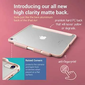 Show moreIntroducing the TineeOwl Mocha iPad Air 5/4 Case, an ultra-slim matte case designed specifically for the iPad Air 5th and 4th Generation (2022, 2020). This case showcases an elegant pale pink hue while offering superior protection, ensuring your device remains pristine throughout daily use. Crafted from high-quality materials, it features a feather-light design that doesn’t compromise on durability, boasting both a soft front and a hard, clear plastic back that allows the vibrant colors of your iPad to shine through. The case is also designed for functionality, seamlessly integrating a pencil holder that keeps your Apple Pencil securely stored and easily accessible. This minimalistic case is perfect for anyone who wants protection without the bulk, making it an ideal travel companion.