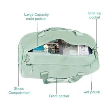 Show more Introducing the TINNIVI Sports Gym Bag Travel Duffel Bag - a versatile and stylish solution for all your travel and gym needs. Made from lightweight water-resistant nylon, this bag is designed to withstand the rigors of both indoor and outdoor activities while keeping your belongings safe and dry. With thoughtful features like a separate shoe compartment and a waterproof wet pocket, this bag ensures that you can stash away all your essentials without hassle. The vibrant green color adds a pop of fun to your journey, making it suitable for everyone, whether you're heading to the gym, on a weekend getaway, or an extended travel adventure.