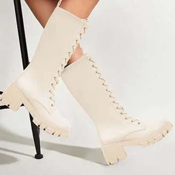 Show moreStep into elegance and confidence with the TINSTREE Women’s Knee High Platform Boots. Crafted from premium leather, these boots showcase a stunning cream color that adds sophistication to any outfit. Designed with both style and comfort in mind, they feature a unique buckle and lace-up detailing that not only enhance their aesthetic but also ensure a secure fit. The mid-calf height is perfect for all seasons, whether you're dressing up for a night out or down for a day of fun. The side zip-up feature makes it easy to slip them on and off, making them a practical choice for your busy lifestyle.