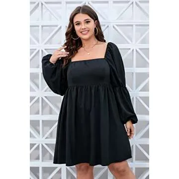 TINSTREE Womens Plus Size Square Neck Dress Long Puff Sleeve Flowy Swing A-Line Short Casual Mini Dress Black