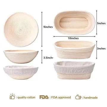 Show more Introducing the Tintonlife 11pcs Banneton Bread Proofing Baskets Set, an essential companion for every baking enthusiast and seasoned chef alike! Handcrafted from 100% natural rattan cane, these vibrant baskets provide a smooth, non-stick surface free of chemical odors and splinters. Their exquisite craftsmanship isn't just eye-catching; it's designed for practical usage, facilitating moisture wicking from the dough and enabling the creation of that perfect, crispy crust that bakers crave. The set includes oval and round baskets to cater to different baking needs, making it versatile for various types of dough, particularly sourdough.