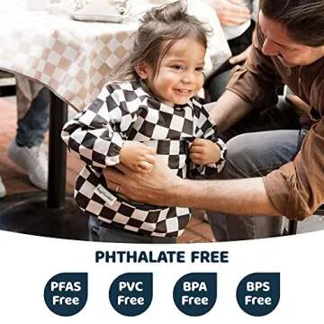 Show more Introducing the Tiny Twinkle Mess Proof Baby Bib, a must-have for every new parent! Designed with care and precision, this adorable full-sleeved bib is crafted from soft, lightweight, and eco-friendly fabric made from 100% recycled polyester. Its special waterproof back coating ensures that your baby's clothing stays protected from spills and messes. A standout feature of this bib is its open pocket, specifically designed to catch food and reduce cleanup time during meal times, making it an essential in your baby feeding supplies. Ideal for ages 6 to 24 months, this bib comes in charming checkered designs that will brighten up any mealtime.