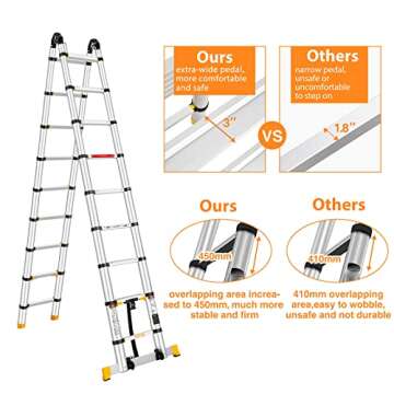 TIQTAK One Button Retractable A Frame Extension Ladder 16.5 ft with Stabilizer Adjustable Height Aluminum Telescoping Collapsible Ladder with Rolling Wheels Heavy Duty 330 lb Capacity for Household