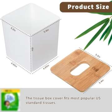 ... Show more Transform your living spaces with this exquisite tissue box holder made from premium natural bamboo and sustainable plastics. This innovative design seamlessly blends function with aesthetic charm, catering to various decor styles, from modern to farmhouse and boho themes. Its perfect dimensions of 5.2L x 5.4W x 6H inches ensure compatibility with most standard tissue boxes, making it a versatile addition to your home.