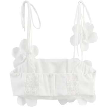 TISTIK Women's 3D Flower Crop Top Elegant Lace-up Camisole Skinny Spaghetti Strap Tank Top Vest Vacation Outfits, Medium, White