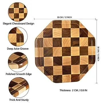 TJ POP End Grain Wood Cutting Board With Juice Groove, Octagon Serving Board For Kitchen, Flippable Charcuterie Board For Cheese, Bread & Fruits, 12x12x0.8 Inch