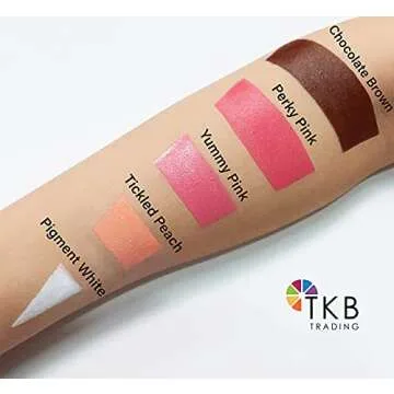 The kit includes five TKB Lip Liquid Sample colors: Pigment White, Tickled Peach, Yummy Pink, Perky Pink, and Chocolate Brown.