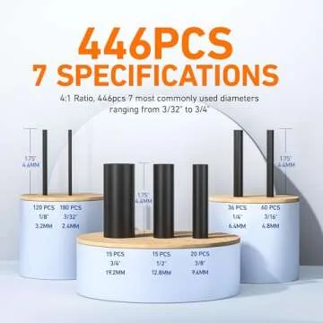 Show more Introducing the ultimate solution for all your wiring needs – the TKDMR 446-piece Heat Shrink Tubing Set. Perfectly tailored for both amateurs and professionals, this kit is designed to tackle any project with ease and precision. Featuring a unique 4:1 shrink ratio, these tubes shrink down to 1/4 of their original diameter, providing a secure and watertight fit for various applications. Each tube measures 1.75 inches in length and comes precut for your convenience, making installation a breeze.