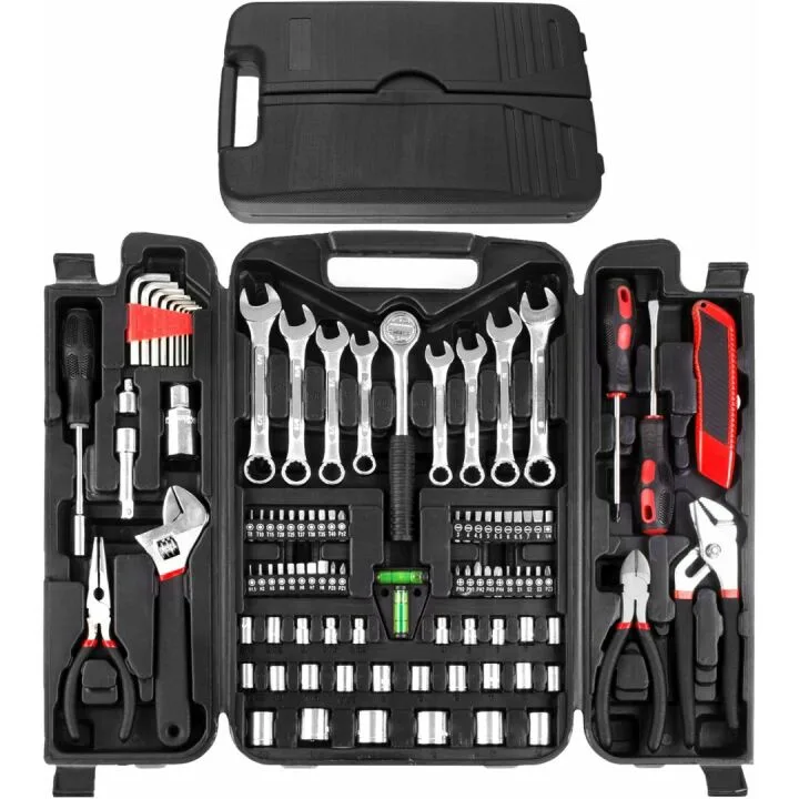 The set includes essential tools such as an adjustable wrench, pliers, socket bits, and more, all organized in a durable plastic toolbox.