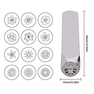 Show more Unleash your creativity with our exquisite Metal Stamping Kit, designed specifically for flower enthusiasts and DIY jewelry makers! This impressive set includes 12 meticulously crafted stamps, each featuring a unique flower design that will elevate your metalworking projects.