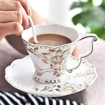 Tmore Porcelain Tea Cup and Saucer Set - Luxury Coffee Mug with Gold Trim
