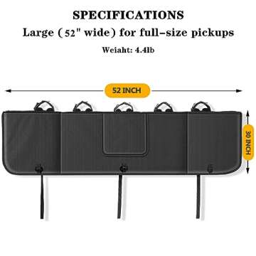 Show moreIntroducing the TNINE 52 Inch Tailgate Pad for Bikes, the ultimate solution for cycling enthusiasts who value adventure as much as they value the integrity of their pickup truck. Crafted from high-quality 900D waterproof and abrasion-proof fabric, this tailgate pad is designed to withstand the elements while keeping your precious bikes safe. With its robust, weather-resistant construction, you can hit the road without worrying about the wear and tear that comes from rugged terrains or unforeseen weather conditions.