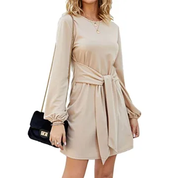 Tobrief Tunic Dress for Women - Tie Waist Elegant Long Sleeve Winter Dress in Oatmeal XL