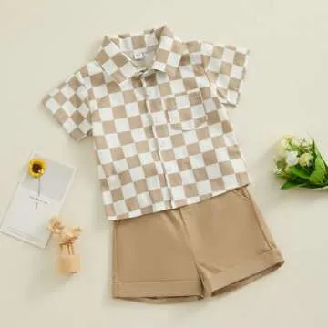 Show moreIntroducing the perfect blend of comfort and style, the Toddler Baby Boy Clothes Checkered Short Sleeve Button Up Shirt Top and Shorts Set. Designed with your little one's playtime needs in mind, this two-piece summer outfit features a stylish checkered plaid button-down shirt and comfortable shorts. Made from high-quality polyester fabric, it ensures a soft hand-feel and is gentle on the skin, making it an ideal choice for warm summer days. Its lightweight and breathable properties allow for easy movement and maximum comfort, letting your child enjoy endless hours of fun. Available in chic green, khaki, and black checkered designs, this outfit elevates your toddler's summer wardrobe while ensuring he looks absolutely adorable during playdates or special occasions.