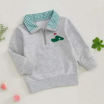 Toddler Baby Boy Golf Outfit Golf Flag/Cart Embroidery Quarter Zip Sweatshirt Plaid Lapel Long Sleeve Polo Shirt Top (Gray, 6-12 Months)