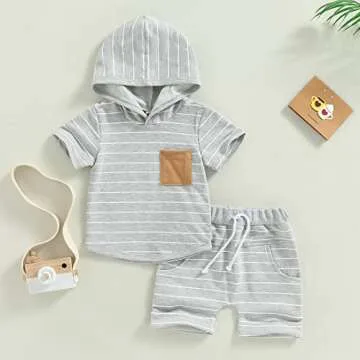 Toddler Baby Boy Summer Outfit Short Sleeve Hooded Stripes Top Casual Shorts Set Infant Newborn Clothes 6 12 18 24 Month (Gray, 18-24 Months)