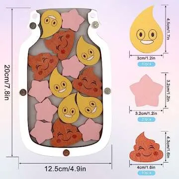 Show more Introducing the Toddler Reward Jar, a delightful and motivating tool designed to encourage positive behavior in young children. This charming reward jar comes with a variety of fun accessories that inspire kids to reach their goals. Inside the package, you'll find 20 beautiful star tokens, 10 amusing poop symbols, and 10 refreshing water drop symbols, all thoughtfully crafted for easy use. The jar can be conveniently hung on the wall or placed on a table, making it an eye-catching addition to any room.