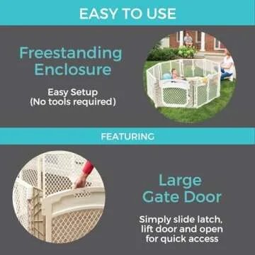 Show more Introducing the **Toddleroo by North States Superyard Ultimate 8 Panel Free Standing Play Yard**, designed as the ultimate solution for parents seeking a safe, spacious, and adaptable play environment for their children and pets. This cleverly engineered playpen offers an impressive 6.5 feet width corner to corner and stands 26 inches tall, providing a generous area of 34.4 square feet where your little ones can explore and engage in play without limitations. The Superyard is crafted from durable, kid-tough plastic, ensuring that it withstands the rigors of daily use while remaining lightweight and foldable for easy transport. Perfect for both indoor and outdoor use, this play yard is an investment in safety and versatility, cultivated by a trusted brand that has prioritized child safety since its inception in 1953.