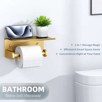 Show moreIntroducing the revolutionary Toilet Paper Holder with Phone Shelf, brought to you by APLusee, this premium bathroom accessory is crafted from top-of-the-line SUS 304 stainless steel with a stunning brushed gold finish. Designed to elevate both functionality and aesthetics, this holder seamlessly integrates into any modern bathroom decor. Featuring a clever phone shelf with upward baffle design, it ensures that your essential items remain securely stored while providing convenient access right where you need it.