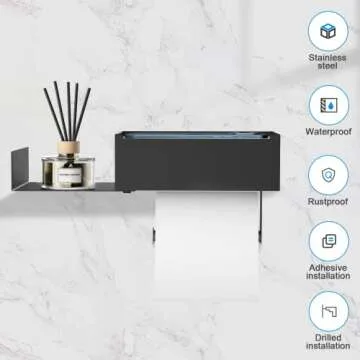 Toilet Paper Holder with Shelf, FUNLEU Flushable Wipes Dispenser for Bathroom, Self Adhesive Toilet Paper Holder with Storage - Stainless Steel Toilet Holder Keep Wipes Hidden Out of Sight, Black