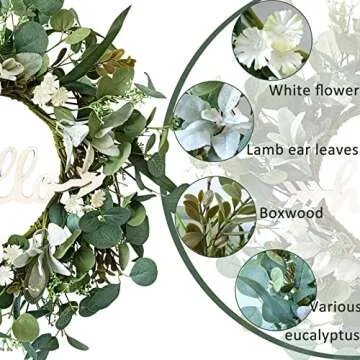 TOKCARE 22 Inch Eucalyptus Wreath with Hello Sign, Spring Summer Wreaths for Front Door Green Winter Wreaths for Front Door Windows,Porch,Fireplace,Indoors and Outdoor Home Decoration