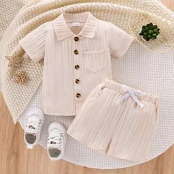 Show more Introduce your little gentleman to the world of style with the TOKIAGO Toddler 3t Boys Clothes Set. This thoughtfully designed ensemble includes a button-down short sleeve shirt and comfy casual shorts, both crafted from premium quality materials. Made from wrinkle-resistant polyester, these garments are lightweight and durable, perfect for the summer adventures of your playful toddler. Say goodbye to worries about wrinkled clothing; let your baby boy roam freely in comfort, ease, and style!