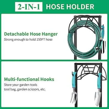 Show moreIntroducing the TomCare Garden Hose Holder, where functionality meets durability in innovative design. This upgraded hose holder features a stellar configuration boasting four sturdy spikes for enhanced stability and support, making it suitable for up to 160FT hoses. The unique design includes two multi-functional tool hooks on the back, enabling you to organize and hang essential garden tools like sprinklers, hand shovels, and hand rakes—all in one convenient location. Designed to keep your yard clean, tidy, and clutter-free, this hose stand is a must-have for any gardening enthusiast.