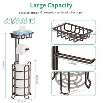 Introducing the TomCare Toilet Paper Holder - an upgraded addition to your bathroom that combines functionality with style. This free-standing toilet paper holder is designed with four raised feet to ensure maximum stability while keeping your toilet paper off the floor, ensuring it remains clean and dry. The elegant bronze finish is not only attractive but also serves to complement any décor, providing a perfect blend of utility and aesthetics to your space. Enjoy the convenience of easy...