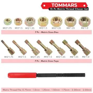 The **TOMMARS 15-Piece Metric Thread Chaser Set** is an indispensable tool kit designed for both professional mechanics and DIY enthusiasts. This comprehensive set includes essential thread sizes—**M12x1.75, M12x1.5, M12x1.25, M10x1.5, M10x1.25, M8x1.25, and M6x1.0**—along with a specialized thread restorer file. Crafted from premium **carbon steel**, each component ensures maximum strength and durability, capable of restoring worn and damaged threads without compromising the integrity of the surrounding...