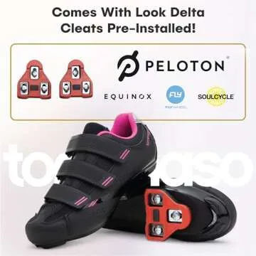 Show more Experience the pinnacle of cycling performance with our top-of-the-line cycling shoes, crafted with Italian precision and designed specifically for Peloton enthusiasts. Our brand has been a symbol of quality cycling products since 1985, and we continue to innovate to bring you shoes that not only enhance your riding experience but also revolutionize your workouts. Each pair comes with premium Look Delta cleats pre-installed, making it easier than ever to lock into your bike without the hassle of traditional setups.