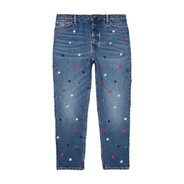Show more Introducing the Tommy Hilfiger Women's Adaptive Tommy Embroidery Mom Fit Jean with Magnetic Fly Closure, a stylish nod to 90s fashion combined with modern adaptive design. These jeans are tailored not just for fashion, but also for functionality, with a VELCRO brand closure and magnetic fly that mimic a traditional button and zipper, making them incredibly easy to wear. Crafted with a beautiful all-over Tommy motif embroidery on a versatile medium wash denim, these jeans embody comfort without sacrificing style, ensuring you look as good as you feel. The high-rise tapered fit sits above the waist and features a straight cut that tapers at the ankle, providing a flattering silhouette for everyone. With an inseam of 27 inches, they are adept for a variety of body types and heights. Embrace the confidence and convenience that this adaptive collection brings, making wardrobe choices effortless and chic.