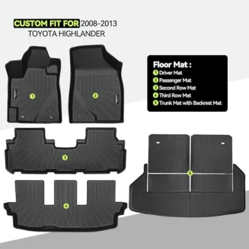 Show more Shield your 2008-2013 Toyota Highlander from the rigors of daily life with the **TONGAMA Floor Mats**. Designed specifically for this vehicle model using advanced 3D laser scanning technology, these mats promise a precise fit that not only looks good but also performs exceptionally. Whether you’re dealing with muddy boots, spilled drinks, or pet hair, these mats provide unparalleled protection for your car’s interior. With a comprehensive package that includes floor mats, a trunk mat, and backrest protectors, you can enjoy the peace of mind knowing your vehicle is covered in all aspects.