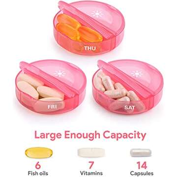 Each of the seven compartments in this weekly organizer is spacious enough to hold a variety of pills, while the AM/PM icons and printed week dates simplify your daily doses, effectively eliminating any chance of confusion. Whether you're on a business trip, vacation, or just going to work, this travel-friendly design ensures you have all your essential vitamins and supplements right at your fingertips.