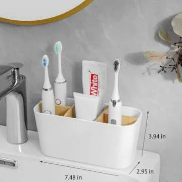 Toothbrush Holders for Bathrooms, Bamboo Tooth Brush Holder with 5 Slots Bathroom Vanity Organizer Countertop for Electric Toothbrushes, Toothpaste, Razors - White