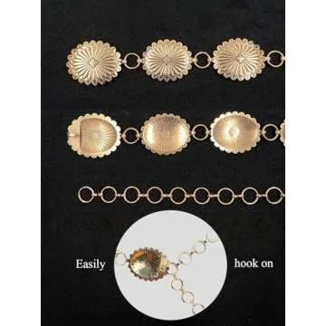 Show more Discover the essence of Western chic with our stunning Gold Concho Belt, a fashionable statement piece designed specifically for women. This belt features a full wrap of oval conchos that embrace your waist beautifully, accommodating waists up to 35 inches with the added flexibility of an extension chain. Crafted with meticulous attention to detail, the smooth and glossy surface of the belt is achieved through highly polished finishing and electroplating, ensuring that the brilliant color remains vibrant and resistant to fading.