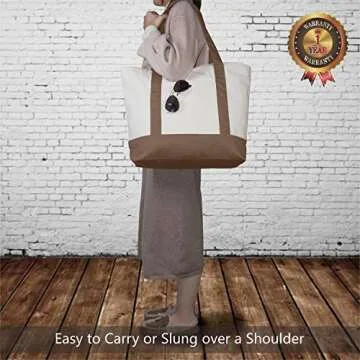 TOPDesign 1-Pack Canvas Tote Bag with an External Pocket, Reusable Grocery Shopping Bag, Top Zipper Closure, Daily Essentials (Brown/Natural)