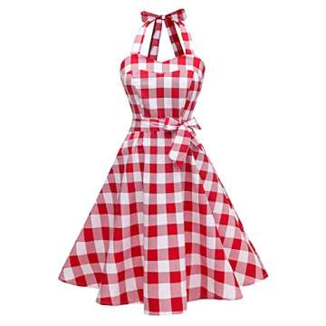 Topdress Women's Vintage Polka Audrey Dress 1950s Halter Retro Cocktail Dress Red White Plaid Large