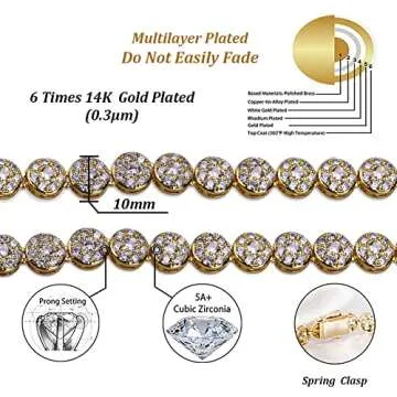 Show moreIntroducing the TOPGRILLZ 1 Row 14K Hip Hop Cluster Simulated Diamond Iced Out CZ Tennis Chain Link Necklace, your ultimate accessory for making a bold statement wherever you go! This stunning piece features an innovative prong-setting design, perfect for both casual and formal occasions. Crafted with the finest 14K gold plating (four times with 0.1μm thickness) over environmentally sustainable brass, it ensures durability without compromising on style. The glimmering 5A+ round cubic zirconia stones are expertly selected to mimic the appearance of real diamonds, so you can shine bright without breaking the bank. This necklace delivers a luxurious look that you can wear with confidence.