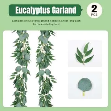 Show more Transform your living spaces or special events into vibrant sanctuaries with the stunning TOPHOUSE Artificial Eucalyptus Garland Set. This exquisite duo boasts a generous length of 6.5 feet each, comprising rich, gray-green silver dollar eucalyptus leaves beautifully intertwined with luxurious willow leaves. Handcrafted with meticulous attention to detail, each leaf offers a lifelike appearance that will charm anyone who glances your way.
