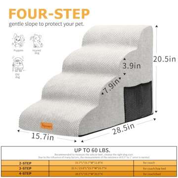 Show moreIntroducing the Topmart High Density Foam Dog Steps, the ultimate solution for your beloved pets to access their favorite spaces with ease and safety. These expertly designed pet stairs feature four spacious tiers, providing extra wide and deep steps (15.75in x 7.1in) that cater to older dogs and cats suffering from joint pain or injuries. Crafted from high-quality 30D high-density foam, these stairs are built to withstand daily use, maintaining their shape and resilience over time. The luxurious corduroy cover not only adds a chic touch but is also waterproof and washable, ensuring maximum cleanliness and hygiene for your furry companions.