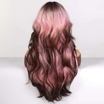 topshe Pink Wigs, Synthetic Wig with Bangs for Women Body Wave Wavy Wigs 24 Inch Long Wig Water Wave Brown Ends Hair Wig Ready to Go